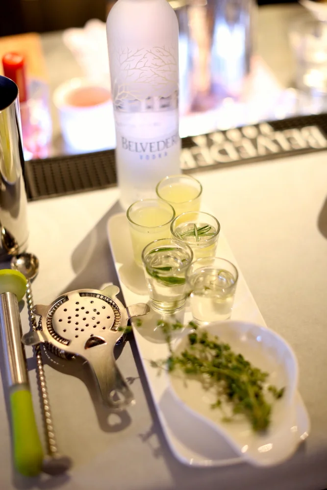 Set of four shot glasses with clear liquids, garnished with rosemary and herbs, on a bar counter, with a bottle labeled "Belvedere" whiskey in the background.